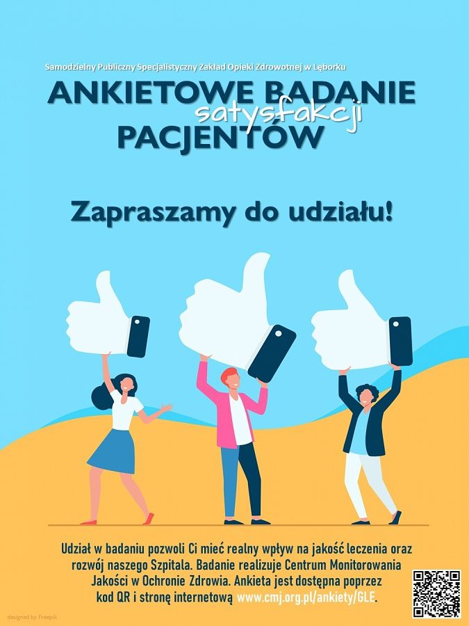 Wszystkich Pacjentów, którzy przebywali na naszych oddziałach szpitalnych, a także ich osoby bliskie zapraszamy do udziału w ankietowym badaniu satysfakcji Pacjentów dotyczącym jakości udzielanych przez nas świadczeń zdrowotnych. Dzięki Waszym opiniom będziemy mogli podjąć działania zmierzające do poprawy komfortu pobytu w naszym Szpitalu oraz zwiększające bezpieczeństwo, nie tylko Pacjentów, ale i osób odwiedzających, a także pracowników szpitala.
