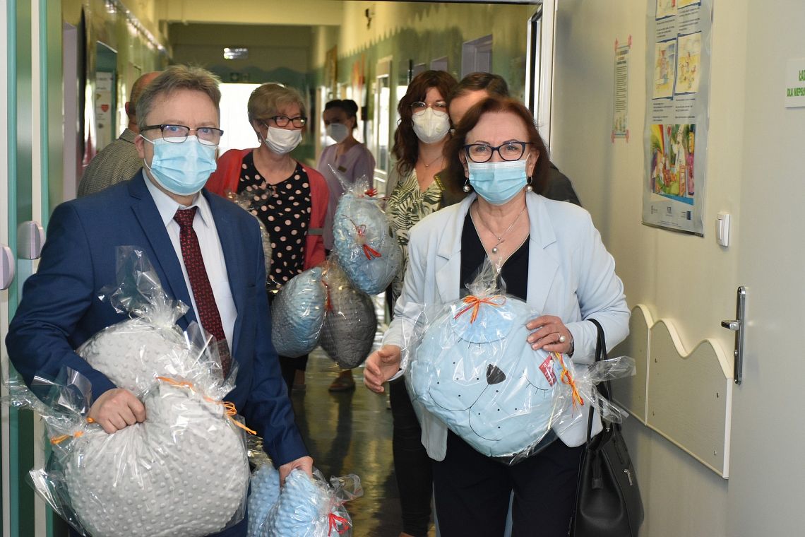 Z okazji Dnia Dziecka na naszych najmłodszych Pacjentów czekała miła niespodzianka. Tego dnia Szpital odwiedzili Starostowie - Pani Alicja Zajączkowska i Pan Edmund Głombiewski. Dzieci przebywające na Oddziale Pediatrycznym i Oddziale Neonatologicznym otrzymały misiowe poduszki, które zostały wykonane przez rękodzielników z powiatu brzeskiego, i które świetnie spełnią się w roli zarówno poduszki jak i przytulanki.