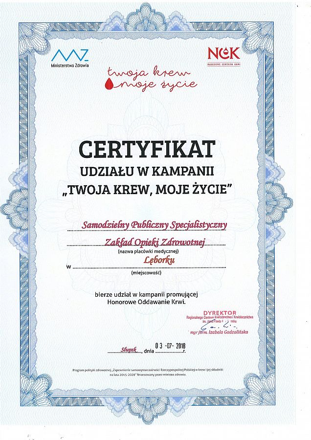 Samodzielny Publiczny Specjalistyczny Zakład Opieki Zdrowotnej w Lęborku otrzymał certyfikat udziału w Kampanii promującej honorowe krwiodawstwo „TWOJA KREW, MOJE ŻYCIE”. Realizatorem programu polityki zdrowotnej pod nazwą: „ Zapewnienie samowystarczalności Rzeczypospolitej Polskiej w krew i jej składniki na lata 2015 – 2020” w zakresie zadania: „Promocja i edukacja w zakresie honorowego krwiodawstwa” jest Regionalne Centrum Krwiodawstwa i Krwiolecznictwa im. Jana Pawła II w Słupsku.