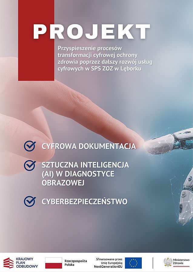 Projekt pt. „Przyspieszenie procesów transformacji cyfrowej ochrony zdrowia poprzez dalszy rozwój usług cyfrowych w SPS ZOZ w Lęborku” to plan gruntownej modernizacji systemów informatycznych naszego szpitala. Nie chodzi tylko o nowy sprzęt, ale przede wszystkim o inteligentne rozwiązania, które usprawnią codzienną pracę lekarzy i pielęgniarek, dając im więcej czasu dla Pacjenta.