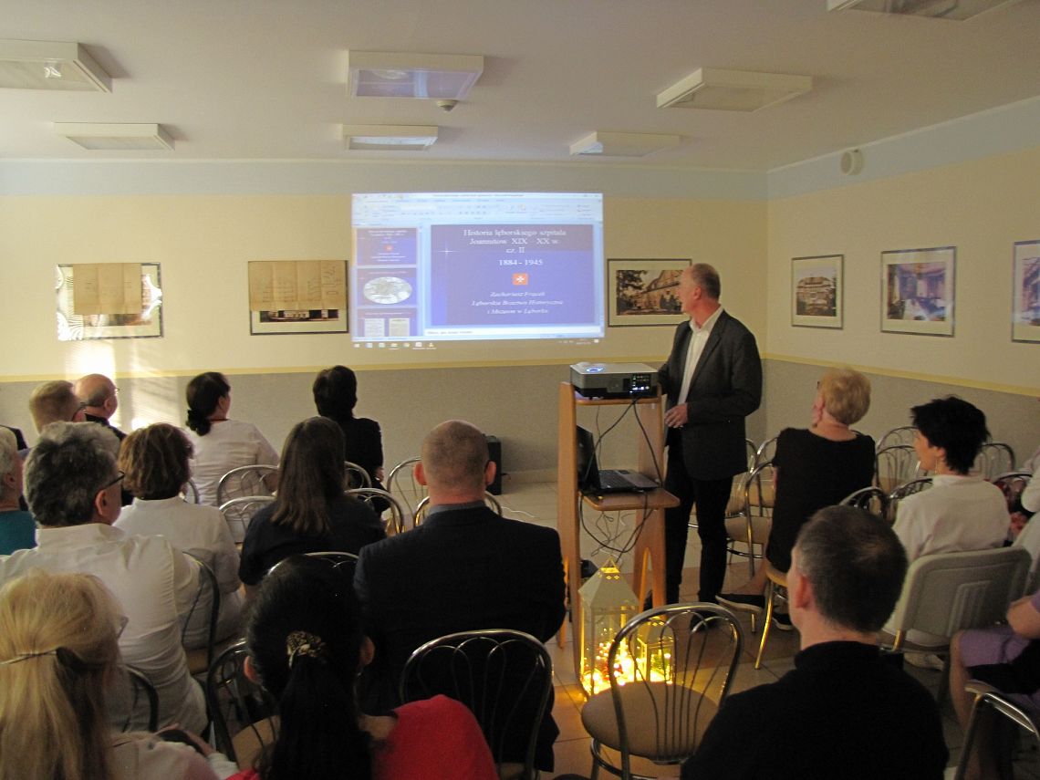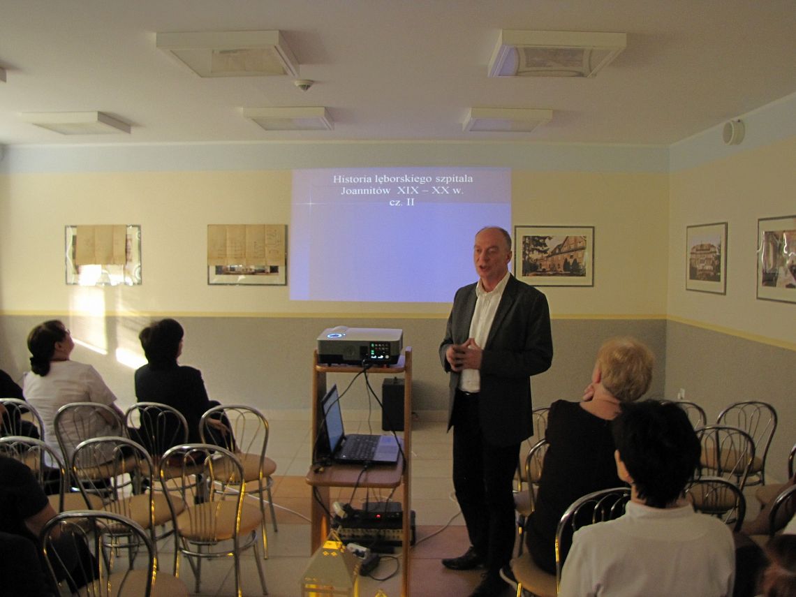 Przed udaniem się na świąteczny poczęstunek pracownicy mieli okazję posłuchać bardzo ciekawej opowieści o historii naszego szpitala, zaprezentowanej przez pracownika szpitalnej Sterylizatorni i jednocześnie miłośnika historii współpracującego z Muzeum w Lęborku – Pana Zachariasza Frącka. Nasz „zakładowy historyk” zgromadził wiele informacji o historii szpitala minionych dekad, a swoją opowieść przedstawił na tle prezentacji przedstawiającej historyczne zdjęcia budynków, map, planów, ale przede wszystkim osób – tych, którzy byli tu przed nami.