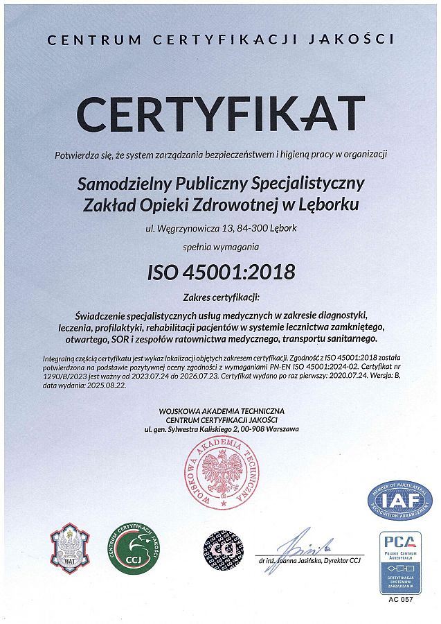 Norma ISO 45001 koncentruje się na zapewnianiu bezpieczeństwa i ochrony zdrowia w miejscu pracy. Nasz personel medyczny jest naszym cennym zasobem, dlatego podejmujemy wszelkie kroki, aby zapewnić im bezpieczne warunki pracy, co przekłada się na jakość opieki, jaką świadczymy.