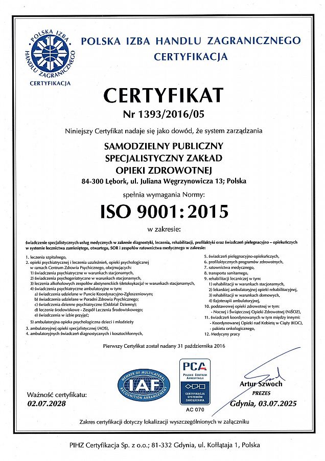 Jesteśmy dumni z naszego zaangażowania w spełnianie tych norm ISO, ponieważ wierzymy, że pomagają one w podniesieniu jakości naszych usług oraz w zwiększeniu Waszego zaufania do naszej placówki medycznej. Wasze zdrowie, bezpieczeństwo i satysfakcja są dla nas najważniejsze, dlatego stale dążymy do doskonalenia naszych praktyk zgodnie z najlepszymi międzynarodowymi standardami