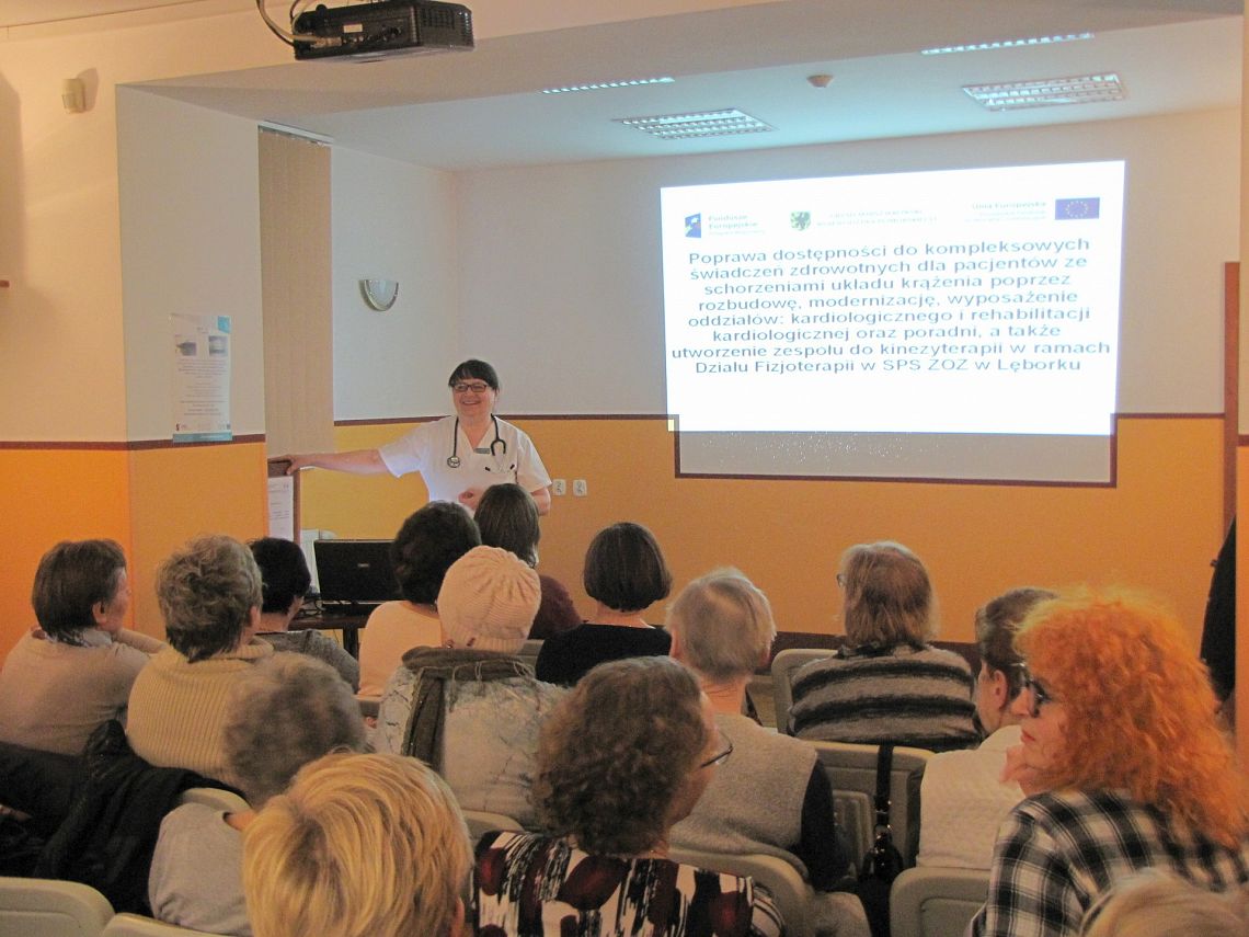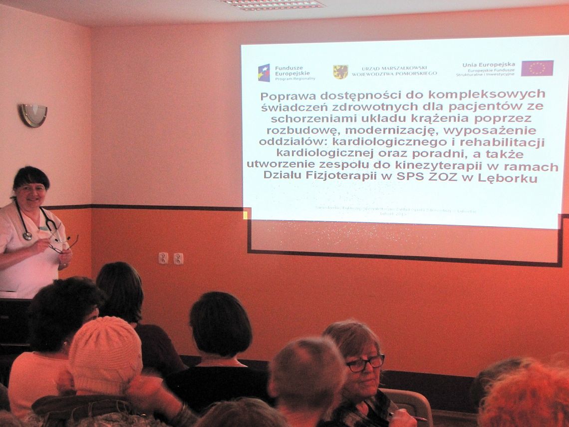 5 marca w sali konferencyjnej Samodzielnego Publicznego Specjalistycznego Zakładu Opieki Zdrowotnej w Lęborku odbyło pierwsze z cyklu 4 szkoleń dla rodzinnych opiekunów osób niepełnosprawnych, które zostało przeprowadzone przez lekarza specjalistę, który omówił czynniki ryzyka i przebiegu z chorób będących najczęstszą przyczyną niepełnosprawności, ze szczególnym uwzględnieniem takich chorób jak np. zawał serca, niewydolność serca, wada zastawkowa serca, udar mózgu oraz zasady profilaktyki wtórnej wystąpienia chorób naczyniowych serca i mózgu z uwzględnieniem rekomendowanych zasad leczenia farmakologicznego oraz konieczności zmiany stylu życia. Kolejne szkolenie odbędzie się 12 marca (wtorek), w godzinach 14.00 - 15:30.