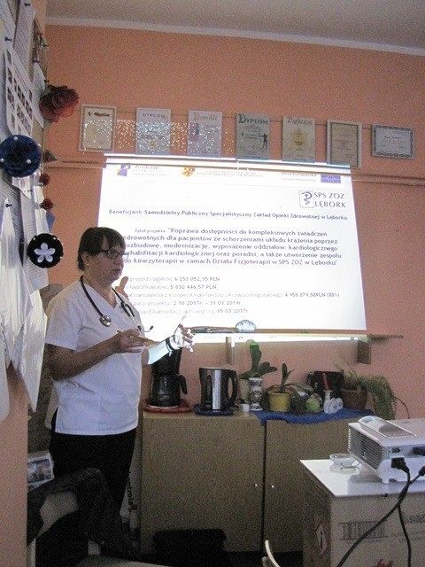 Dnia 8 listopada w siedzibie Stowarzyszenia „Amazonka” odbył się wykład przedstawiający najważniejsze informacje dotyczące realizowanego projektu pn.: "Poprawa dostępności do kompleksowych świadczeń zdrowotnych dla pacjentów ze schorzeniami układu krążenia poprzez rozbudowę, modernizację, wyposażenie oddziałów: kardiologicznego i rehabilitacji kardiologicznej oraz poradni, a także utworzenie zespołu do kinezyterapii w ramach Działu Fizjoterapii w SPSZOZ w Lęborku" przedstawiony przez Lekarza Naczelnego. Po prezentacji Pani Doktor odpowiadała na pytania zadawane przez słuchaczy.